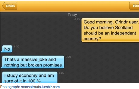 That said, nothing is nearly as interesting as a little experiment run by Tom Court. The unofficial pollster discovered that perhaps the most accurate predictor of the Scottish referendum result was none other than (wait for it) the get-it-on app Grindr.