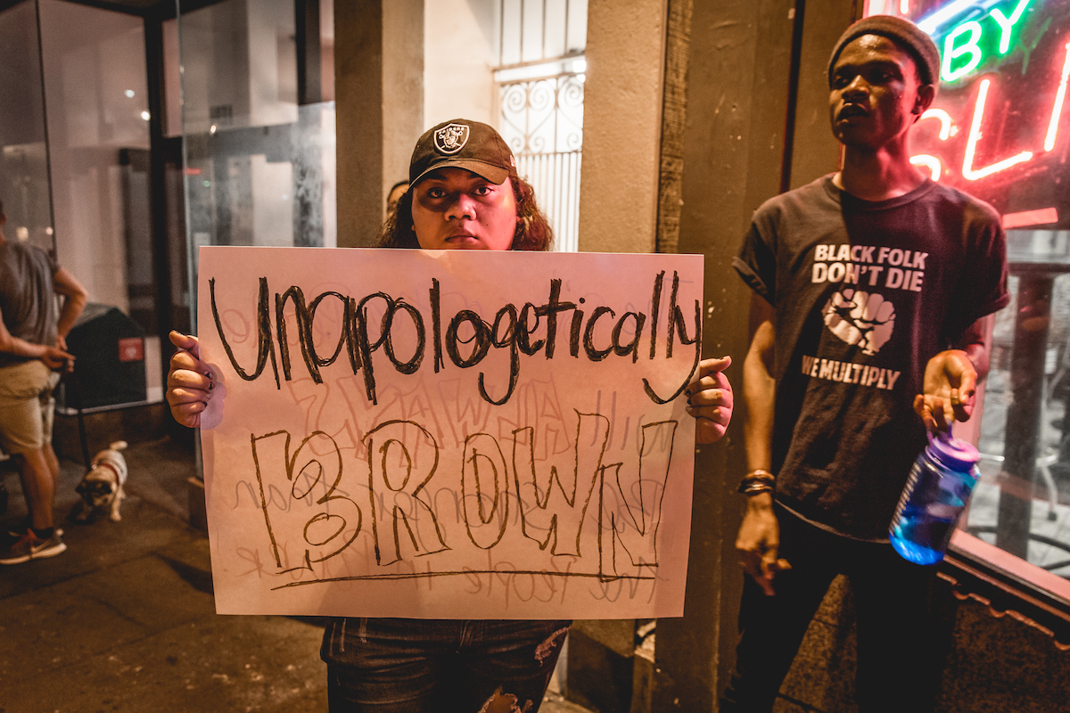 The protest wound through the Mission, a once Latino neighborhood that is now struggling to preserve its identity after becoming a hub for hipster gentrification. Police cars, motorcycles, and foot police followed closeby. Whether this was an intimidation tactic or an effort to increase civilian safety was unclear, but the protesters and the size of the event kept growing.