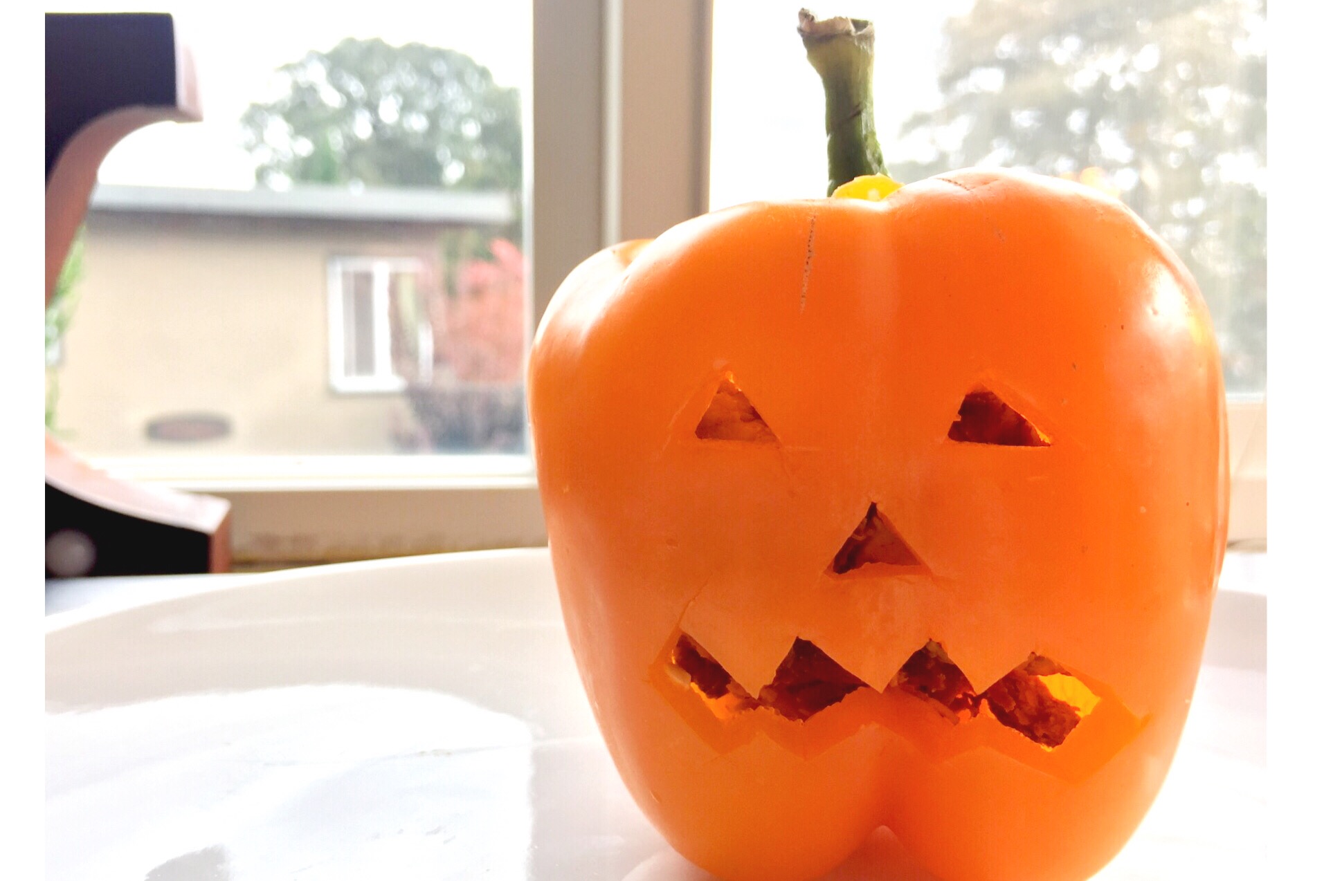 Take your paring knife and carve. Triangles, circles, jigs and jags, go nuts. Marvel at your own craftiness as the bell pepper becomes art before your eyes.